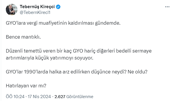 GYO'lara vergi muafiyetinin kaldırılması gündemde yer alıyor. Türkiye'nin 1 numaralı emlak ve konut editörü Tebernüş Kireçci, konuyla ilgili sosyal medyadan yaptığı paylaşımda, GYO'lar ile ilgili önemli değerlendirmelerde bulundu.
