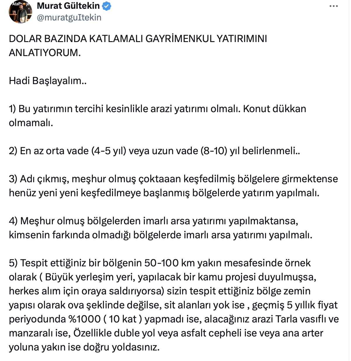 Gayrimenkul Uzmanı Murat Gültekin resmi sosyal medya hesabı üzerinden yaptığı paylaşımda gayrimenkul yatırımında dolar bazlı kazancın nasıl elde edileceğini açıkladı.