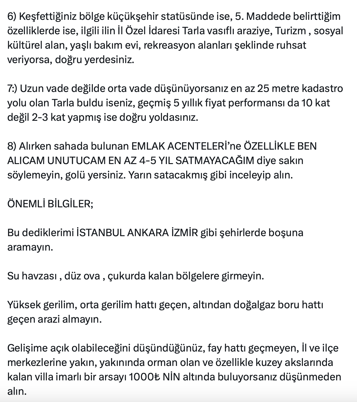 7:) Uzun vade değilde orta vade düşünüyorsanız en az 25 metre kadastro yolu olan Tarla buldu iseniz, geçmiş 5 yıllık fiyat performansı da 10 kat değil 2-3 kat yapmış ise doğru yoldasınız.