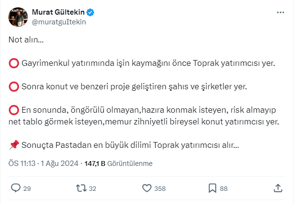 Gayrimenkul uzmanı Murat Gültekin sosyal medya hesabından gayrimenkul yatırımının öneminden bahsederek, işin kaymağını önce toprak yatırımcısının yiyeceğini açıkladı. İşte Gültekin'in o paylaşımı ve gelen yorumlar...