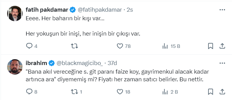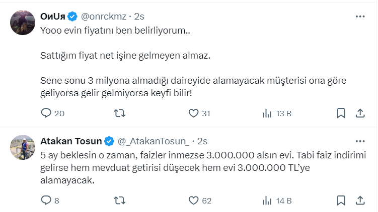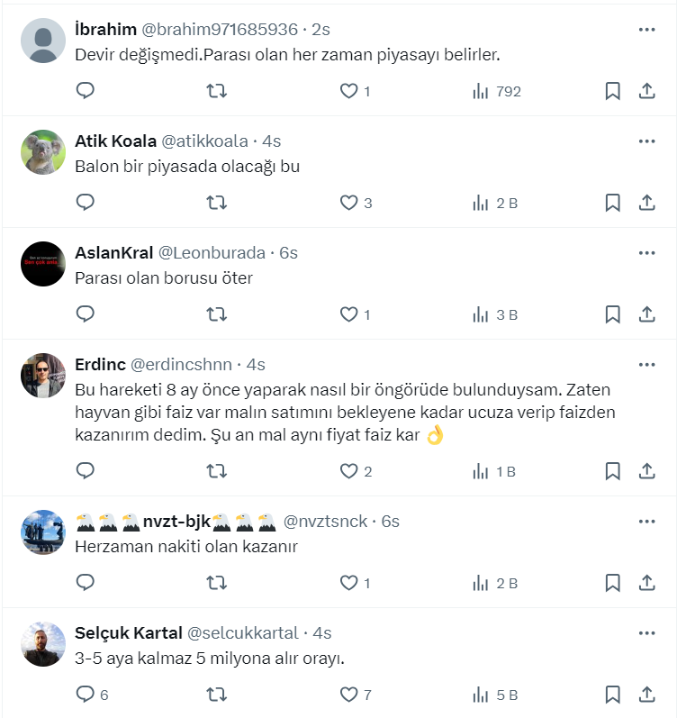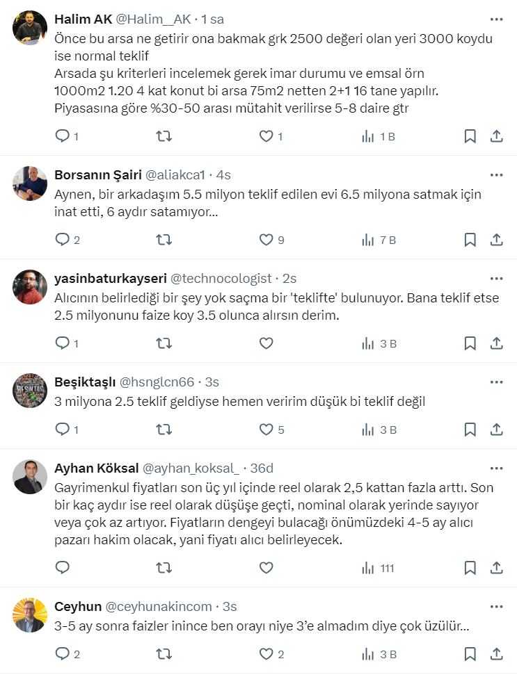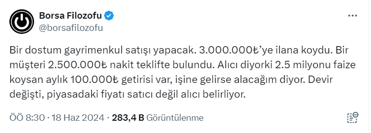 Borsa Filozofu paylaşımında bir dostunun gayrimenkul satışı yapacağını ve 3 milyon TL'ye ilana koyduğunu belirterek, "Bir müşteri 2.500.000₺ nakit teklifte bulundu. Alıcı diyor ki 2.5 milyonu faize koysan aylık 100.000₺ getirisi var, işine gelirse alacağım diyor. Devir değişti, piyasadaki fiyatı satıcı değil alıcı belirliyor." ifadelerini kullandı.
