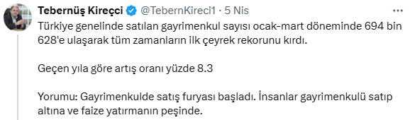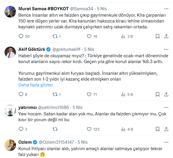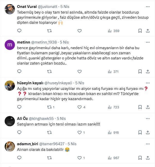 Yorumu: Gayrimenkulde satış furyası başladı. İnsanlar gayrimenkulü satıp altına ve faize yatırmanın peşinde.