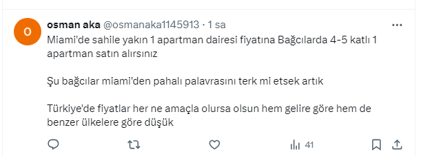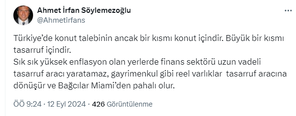 Söylemezoğlu, gayrimenkul gibi reel varlıkların tasarruf aracına dönüştürüldüğünü sonucunda da 'Bağcılar Miami’den pahalı olur.' ifadesini kullandı. İşte Söylemezoğlu'nun sosyal medya hesabı X'ten yaptığı o paylaşım...