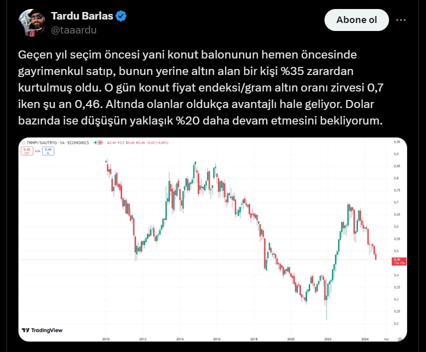 Borsa Temel Analisti Tardu Barlas, https://x.com/taaardu X sosyal medya hesabından yaptığı paylaşımda konut ile altının getirisini kıyasladı. Barlas, paylaşımında şunları söyledi: