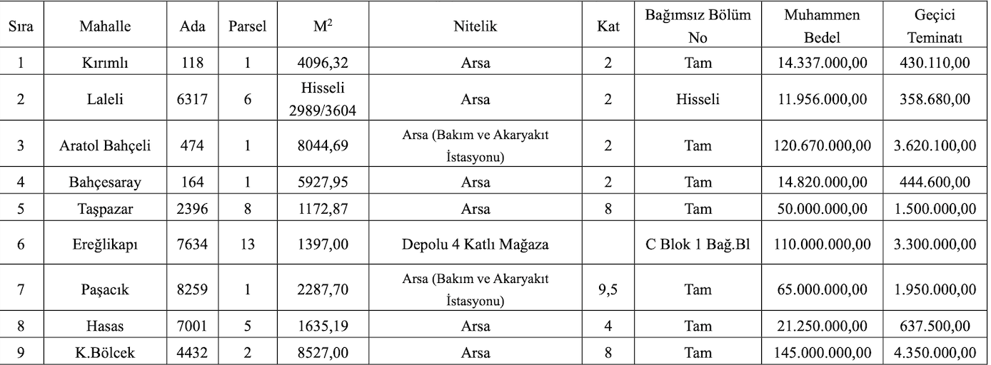 Arsaların geçici teminat bedelleri 358 bin 690 TL ile 4 milyon 350 bin TL arasında değişirken, depolu mağazanın geçici teminat bedeli ise 3 milyon 300 bin TL olarak açıklandı.