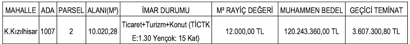 Metrekare rayiç bedelinin 12 bin Türk Lirası olarak açıklandığı arsanın muhammen bedeli 120 milyon 243 bin 360 Türk Lirası, geçici teminat bedeli ise 3 milyon 607 bin 300,80 Türk Lirası olarak açıklandı.
