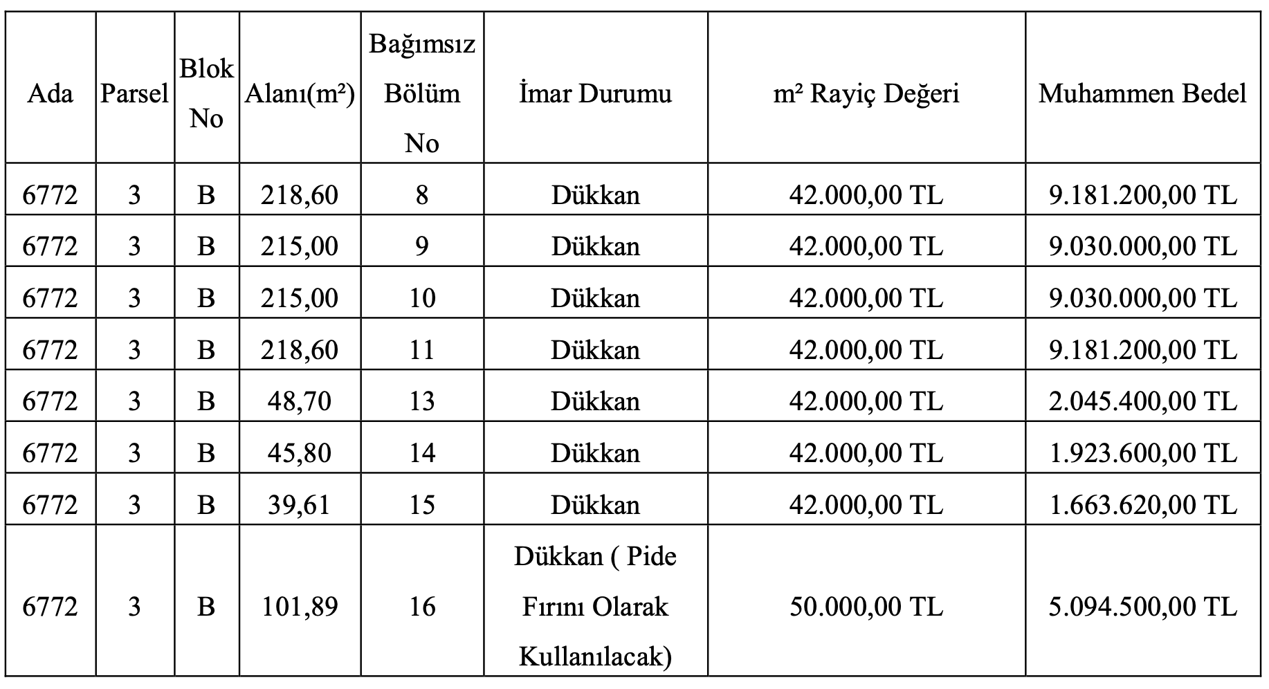 Gaziantep’te yer alan sekiz adet dükkanın alanları 39.61 metrekare ile 218,60 metrekare arasında değişiyor. Söz konusu dükkanların muhammen bedelleri 1 milyon 663 bin 610 TL ile 9 milyon 181 bin 200 TL arasında farklılık gösteriyor.