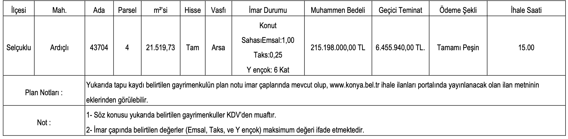 Konya Selçuklu’da yer alan arsa 21 bin 519,73 metrekare alana sahip. Konut imarlı arsanın muhammen bedeli 215 milyon 198 bin TL olarak açıklanırken, geçici teminat bedeli ise 6 milyon 455 bin 940 TL olarak açıklandı.