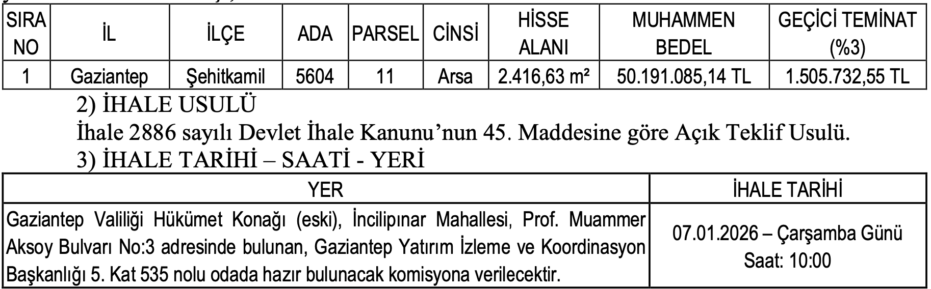 Arsanın satış ihalesi 7 Ocak 2026 tarihinde saat 10.00’da Gaziantep Yatırım İzleme ve Koordinasyon Başkanlığı’nda yapılacak.