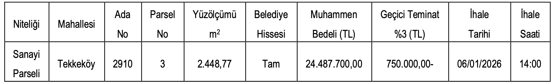 Arsanın satış ihalesi 6 Ocak 2026 tarihinde saat 14.00’te Tekkeköy Belediyesi Meclis Salonunda Encümen huzurunda yapılacak.