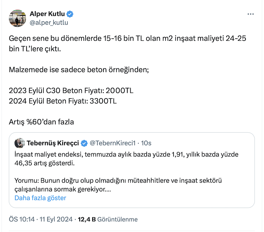 İnşaat Mühendisi Alper Kutlu resmi sosyal medya hesabı https://x.com/alper_kutlu üzerinden yaptığı paylaşımda, Türkiye'nin 1 numaralı emlak ve konut editörü Tebernüş Kireçci’nin inşaat maliyetleri ile ilgili paylaşımını alıntılayarak, maliyetlerdeki artışa değindi.