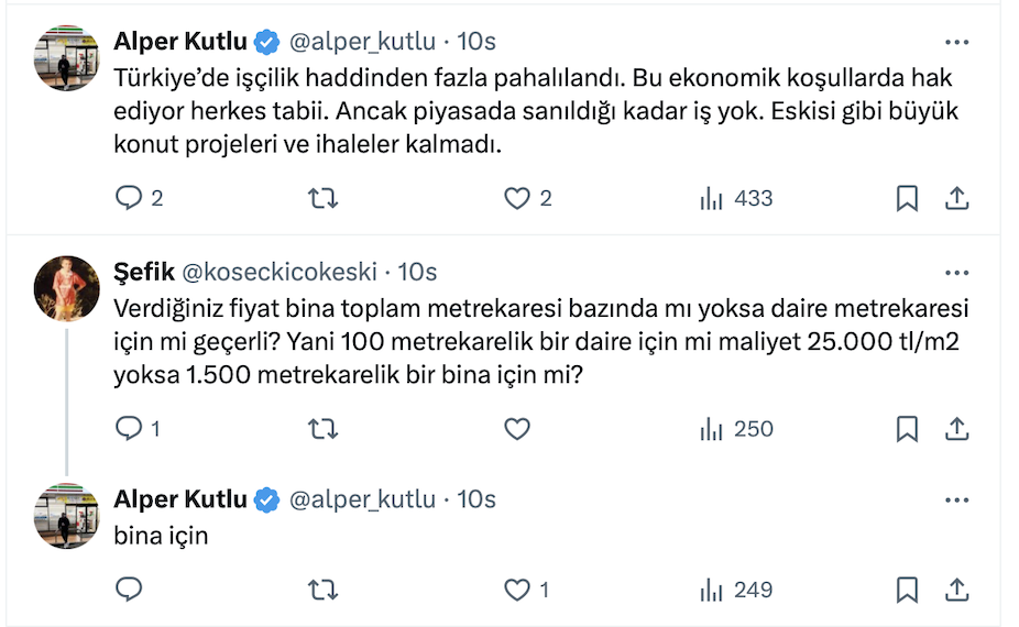 Alper Kutlu resmi yaptığı paylaşımda geçen sene 15-16 bin TL olan inşaat maliyetinin bu sene 24-25 bin TL’ye çıktığını söyledi.