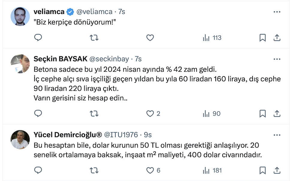 İnşaat Mühendisi Alper Kutlu resmi sosyal medya hesabı üzerinden yaptığı paylaşımda geçen sene 15-16 bin TL olan inşaat maliyetinin bu sene 24-25 bin TL’ye çıktığını belirtti.