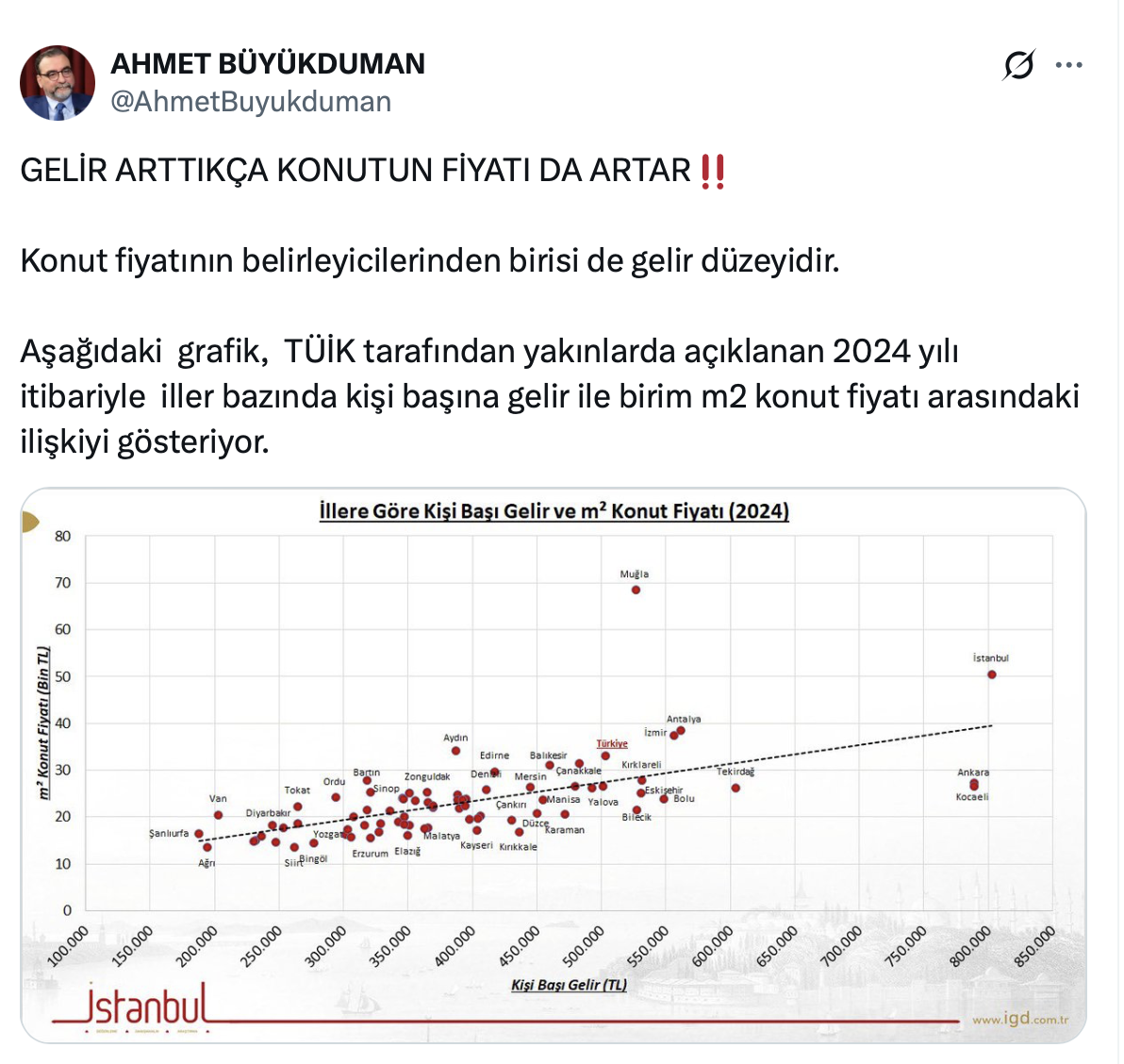 Gayrimenkul Değerleme Uzmanı Dr. Ahmet Büyükduman resmi X hesabı üzerinden yaptığı paylaşımda gelir arttıkça konut fiyatlarının da arttığını belirtti.