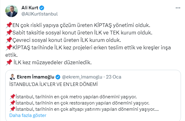 KİPTAŞ Genel Müdürü Ali Kurt sosyal medya hesabından yaptıkları çalışmalarla ilgili ''ilk'' vurgusu yaparak 5 maddelik KİPTAŞ raporunu açıkladı. İşte o rapor...