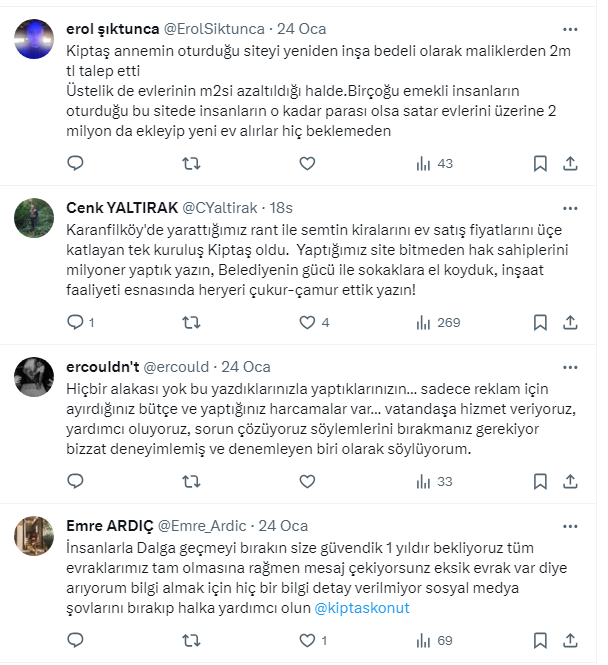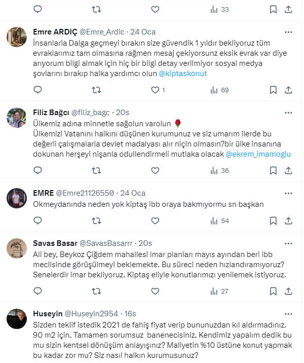 Huseyin @Huseyin2954: Sizden teklif istedik 2021 de fahiş fiyat verip bununuzdan kıl aldırmadınız. 90 m2 için. Tamamen sorumsuz banenecisiniz. Kendimiz yapalım dedik bu mu sizin kentsel dönüşüm anlayışınız? Maliyetin %10 üstüne konut yapmak bu kadar zor mu? Siz nasıl halkın kurumusunuz?