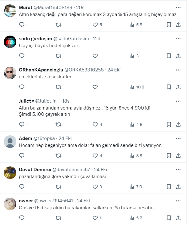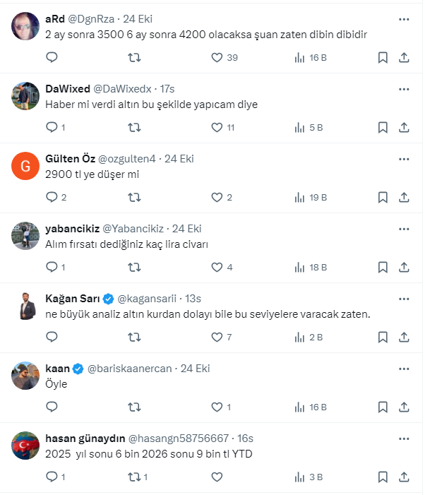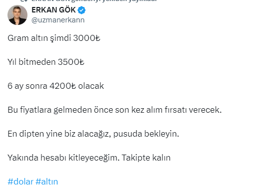 Altın almak için bekleyenleri ise uyaran Gök, 'pusuda bekleyin' diyerek altının alım fırsatı vereceğini açıkladı. İşte Erkan Gök'ün sosyal medya hesabı X'ten yaptığı o paylaşım ve gelen yorumlar...