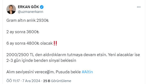 Ekonomist Erkan Gök, 'altın fiyatları ne kadar olacak?' sorusunu sosyal medya hesabından açıklayarak yatırımcılara 'pusuda bekleyin' uyarısında bulundu.
