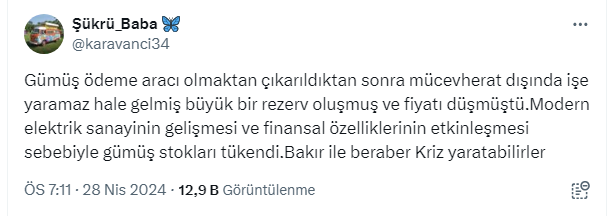 Altın fiyatları son zamanrada rekor seviyelere yükseldi. Şu günlerde altın düşüşe geçse de yüksek seviyelerde kalmaya devam ediyor. Uzmanların öngörüsü ise altın fiyatlarının yıl sonuna kadar yeni bir rekor kırması yönünde. Altın alamayan yatırımcılar ellerindeki parayı değerlendirmek için en az altın kadar değerli metal olan gümüşe yatırım yapıyor Hem yatırımcılardan hem de Modern elektrik sanayinin gelişmesi gümüşte talep patlamasına neden oldu. Sosyal medya hesabından açıklama yapan Şükrü Baba isimli ekonomist gümüşteki talebi değerlendirerek 'kriz'uyarısında bulundu. İşte o paylaşım ve gelen yorumlar...
