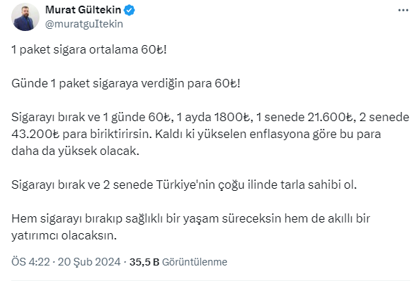 Gayrimenkul uzmanı Murat Gültekin https://twitter.com/muratguItekin X sosyal medya hesabından yaptığı paylaşımda günde 1 paket sigara parasıyla iki yılda tarla sahibi olmanın mümkün olduğunu söyledi. Gültekin sigara hesabını şöyle yaptı: