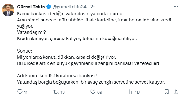 CHP'de genel başkan yardımcısı, genel sekreter ve milletvekili olarak farklı kademelerde görev alan Gürsel Tekin sosyal medyadaki paylaşımında, kamu bankalarının vatandaşın yanında durmadığın söyleyerek eşletirdi.