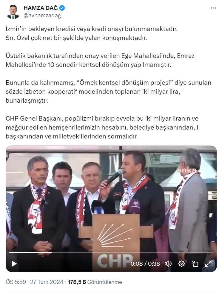 İzmir'de kentsel dönüşüm tartışmaları hız kesmeden devam ederken, AK Parti Genel Başkan Yardımcısı Hamza Dağ'dan da çok konuşulacak bir açıklama geldi. Hamza Dağ CHP Genel Başkanı resmi X hesabı https://x.com/avhamzadag üzerinden yaptığı paylaşımda CHP Genel Başkanı Özgür Özel'in "İzmir'de, İstanbul'da kentsel dönüşüm için bulduğumuz yabancı kredileri dahi onaylamıyorlar. 'Aman bunlar bir iş yaparsa, başarılı belediyelerle birinci parti oldular, bunu sürdürürlerse bizim için tehdit' diyenler bu kredileri onaylamıyor" açıklamasına yanıt verdi.