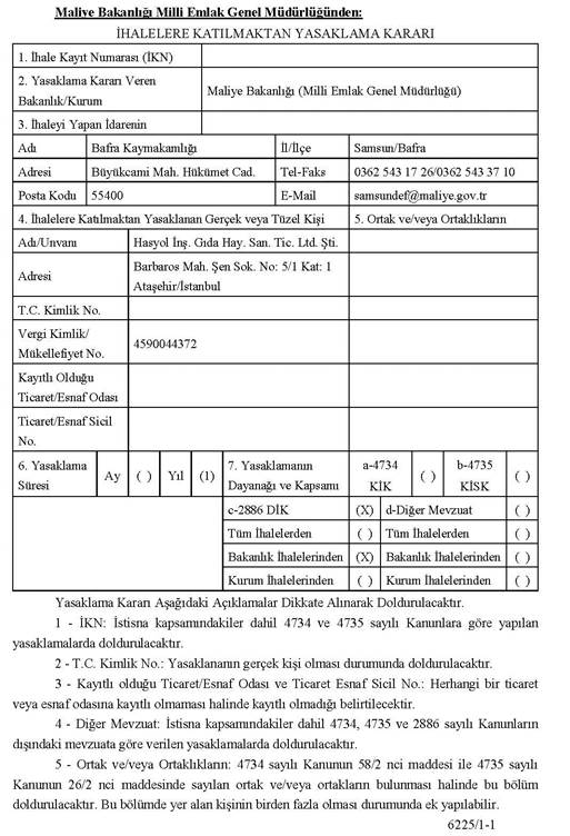 Maliye Bakanlığı Milli Emlak Genel Müdürlüğü 'nden; Hasyol İnş. Gıda Hay. San. Tic. Ltd. Şti. hakkında 1 yıl boyunca ihalelere katılım yasağı çıktı, detaylar ekte yer alıyor...