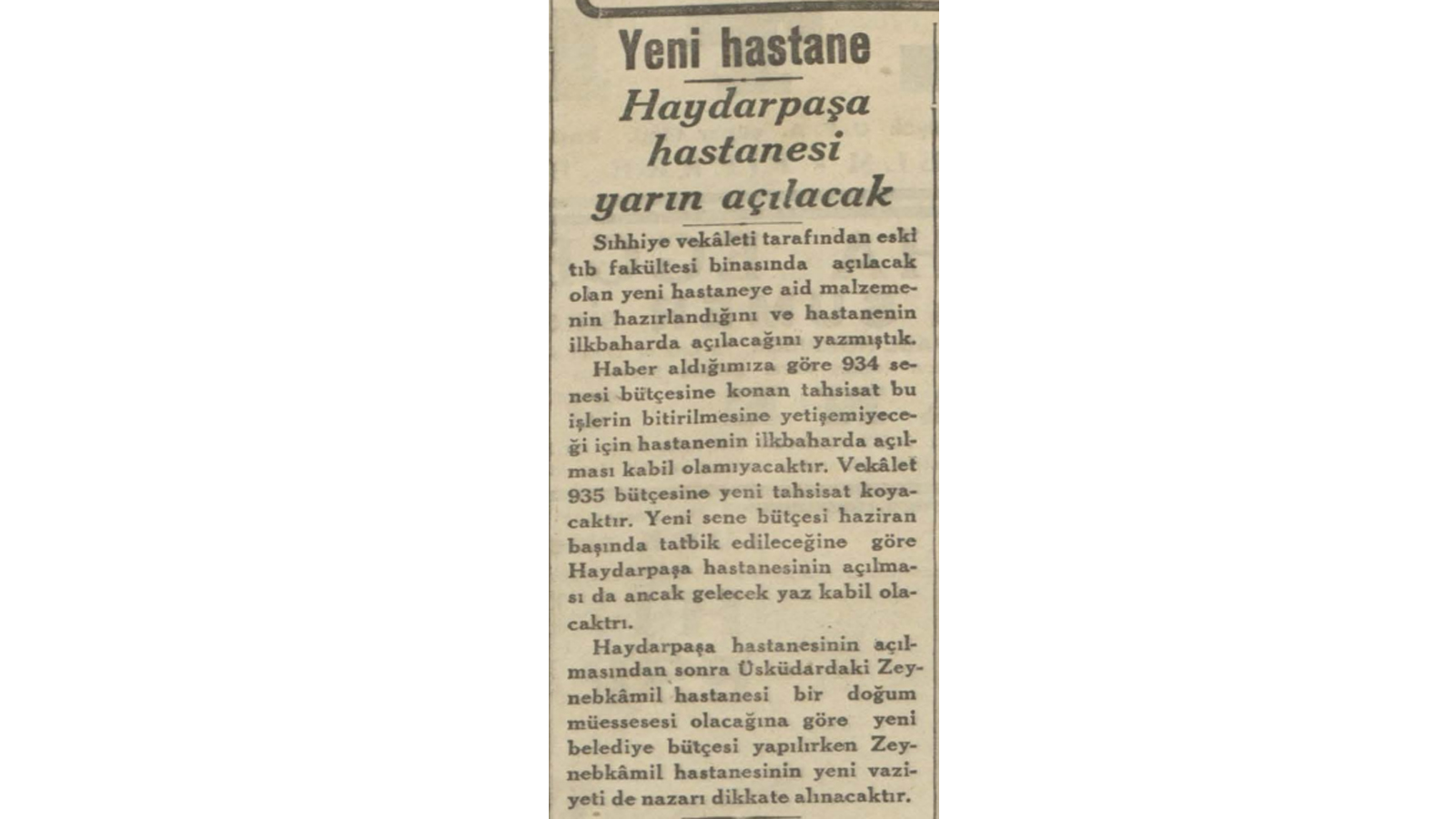 Haber aldığımıza göre 934 senesi bütçesine konan tahsisat bu işlerin bitirilmesine yetişemiyeceği için hastanenin ilkbaharda açıması kabil olamayacaktır. Vekâlet 935 bütçesine yeni tahsisat koyacaktır. Yeni sene bütçesi haziran başında tatbik edileceğine göre Haydarpaşa hastanesinin açılması da ancak gelecek yaz kabil olacaktı.