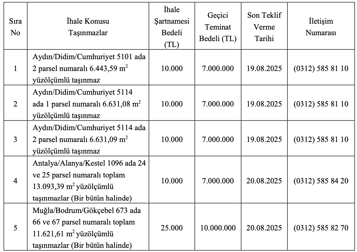 İhaleye katılmak isteyen yatırımcıların, Didim’deki taşınmazlar için 19 Ağustos 2025 tarihinde kadar, Antalya ve Muğla’dakiler için ise 20 Ağustos 2025 tarihine kadar tekliflerini sunmaları gerekli.
