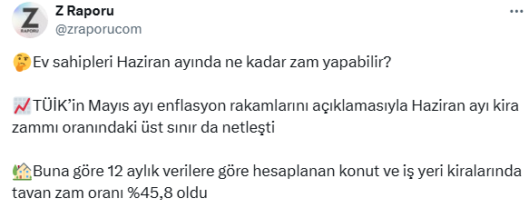 Ekonomininn Z Raporu olan zraporu.com sosyal medya hesabından haziran ayı kira artış oranlarıyla ilgili paylaşım yaptı. İşte ayrıntılar...