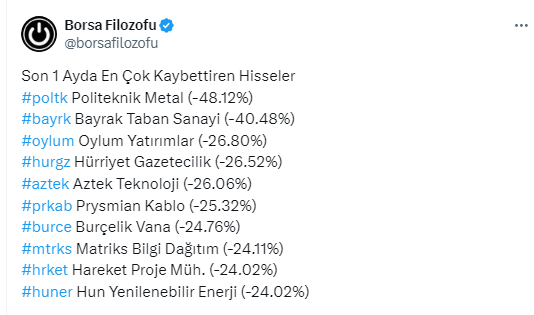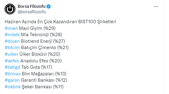 Endeksi yakından takip eden küçük yatırımcı en çok kazandıran ve kaybettiren hisseleri de araştırıyor. Borsa Filozofu, https://x.com/borsafilozofu X sosyal medya hesabı üzerinden yaptığı paylaşımda, Haziran ayında en çok kazandıran ve kaybettiren hisseleri sıraladı. İşte o liste.
