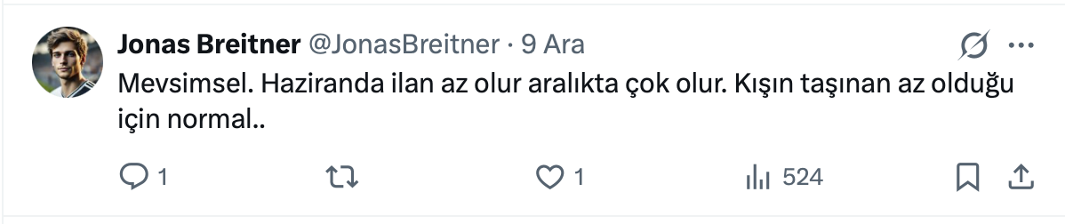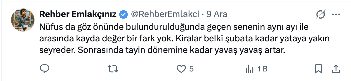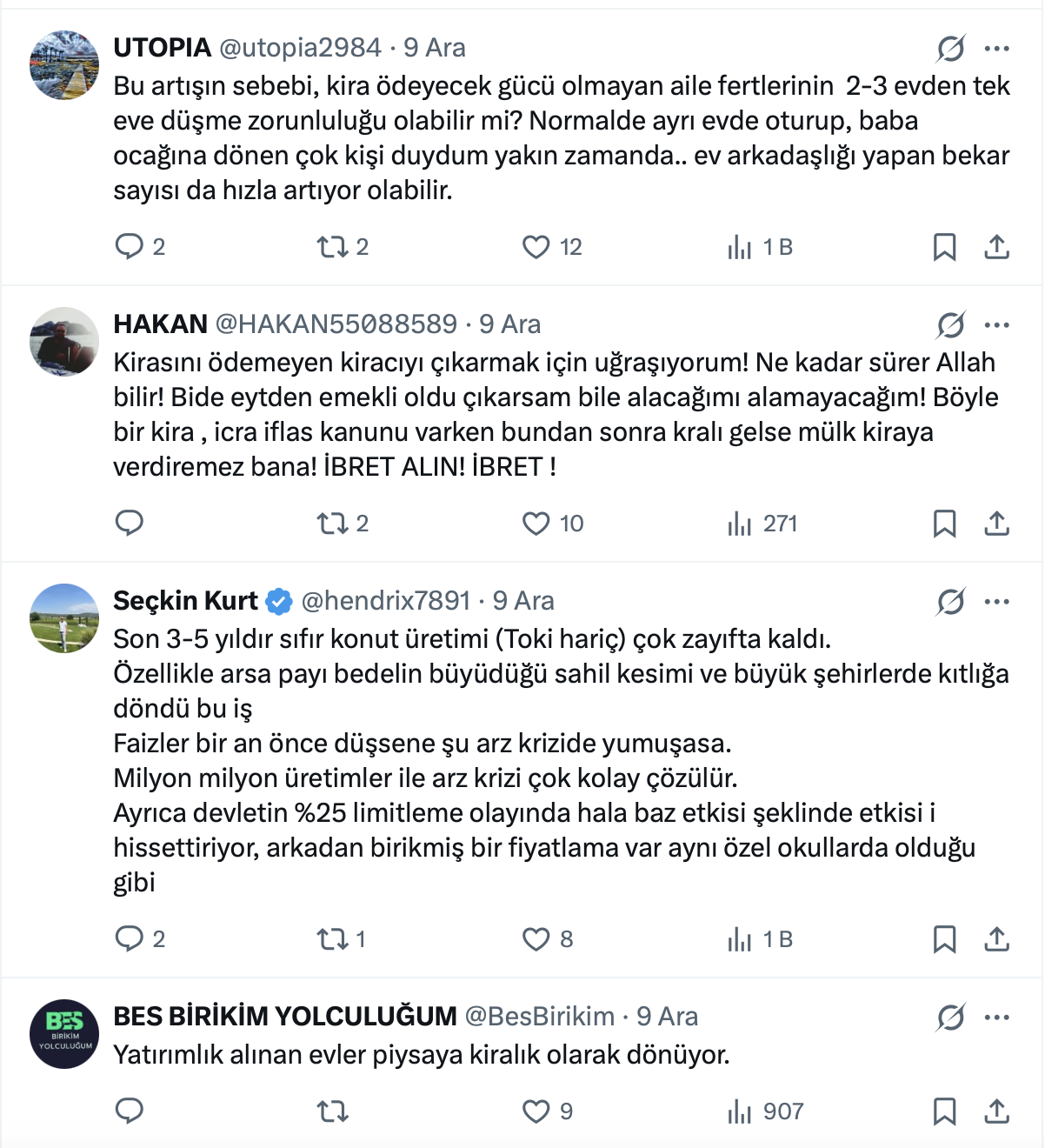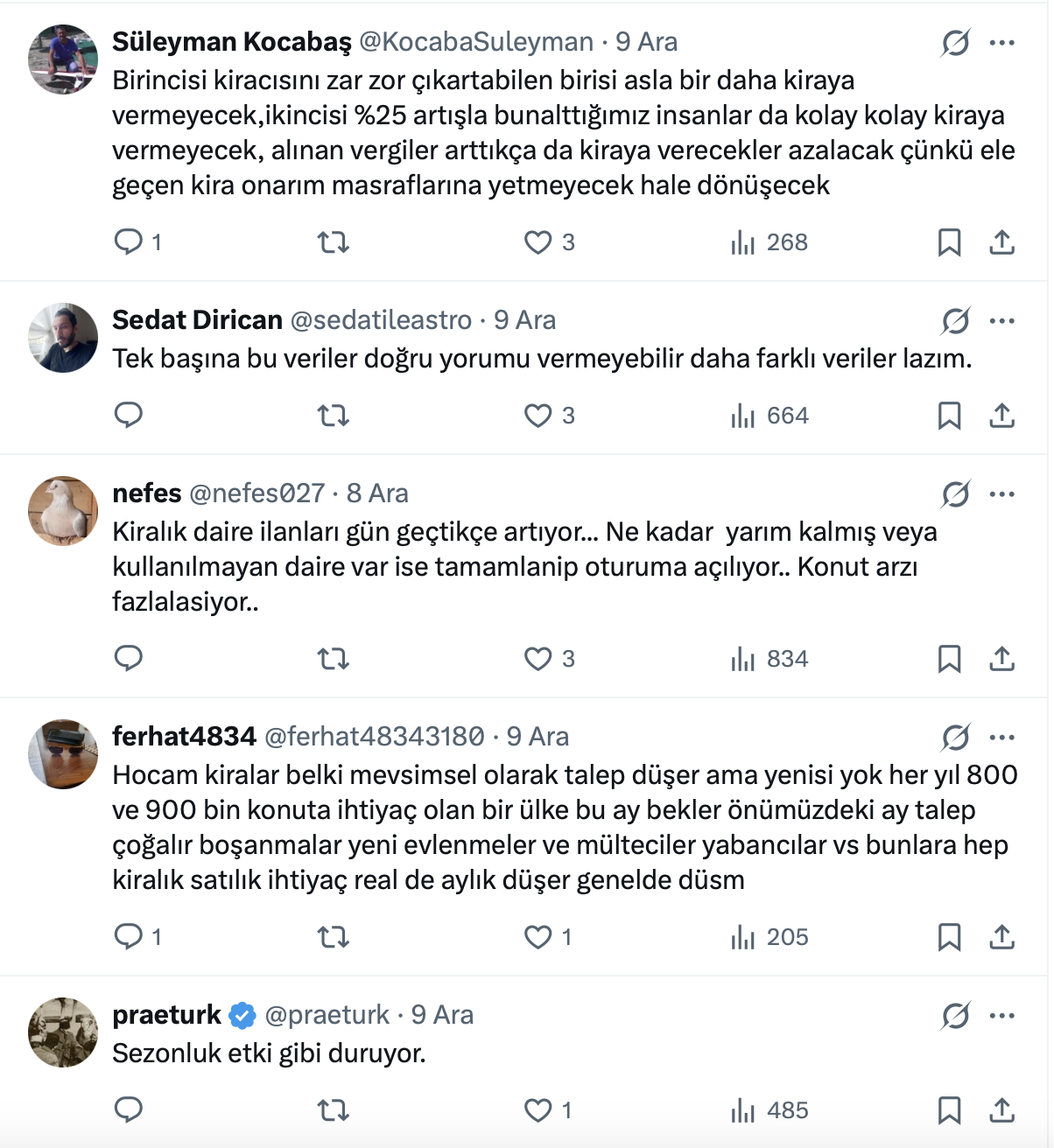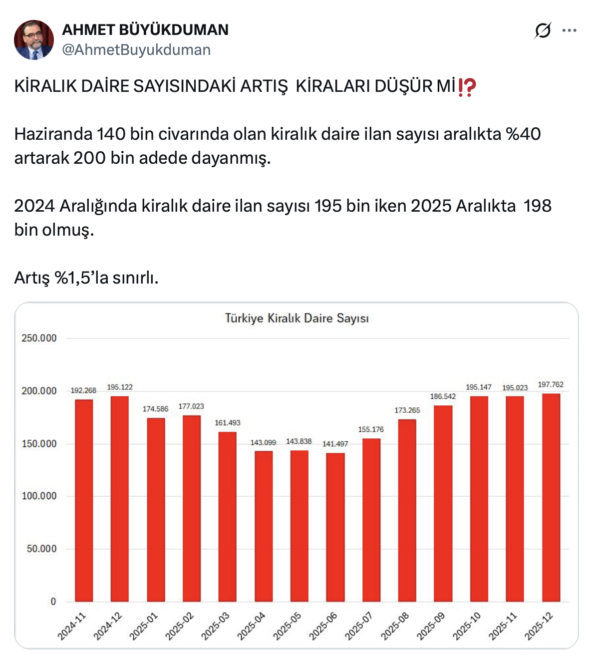 Ahmet Büyükduman resmi X hesabı https://x.com/AhmetBuyukduman üzerinden yaptığı paylaşımda Haziran ayında 140 bin olan kiralık daire ilan sayısının Aralık’ta yüzde 40 artarak 200 bin adede dayandığını belirtti.