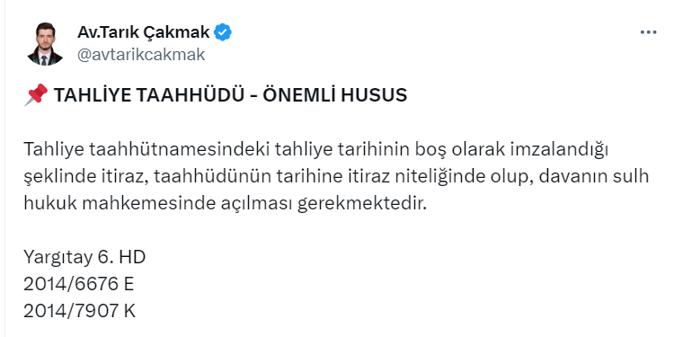 Avukat Tarık Çakmak resmi sosyal medya hesabı üzerinden tahliye taahhüdü ile ilgili çok önemli bir detaya değindi. İşte Tarık Çakmak'ın o paylaşımı...