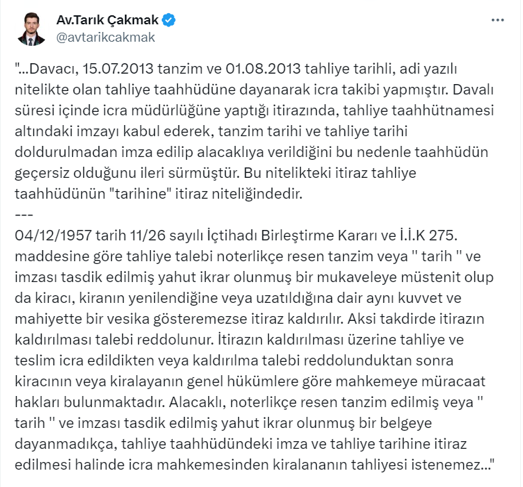 Ev sahipleri ve kiracı hakları ile ilgili olarak yaptığı paylaşımlarla dikkat çeken Avukat Tarık Çakmak da resmi X hesabı https://x.com/avtarikcakmak üzerinden tahliye taahhüdü ile ilgili çok önemli bir detaya değindi