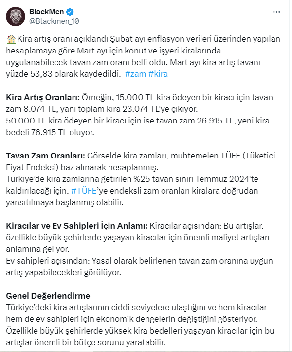 50.000 TL kira ödeyen bir kiracı için ise tavan zam 26.915 TL, yeni kira bedeli 76.915 TL oluyor. Blackmen isimli analist sosyal mdya hesabından mart 2025 kira artış oranını değerlendirdi. İşte o paylaşım...