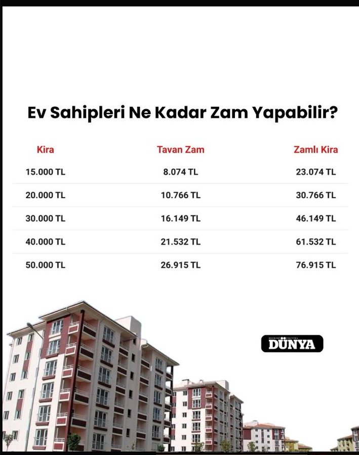 Görselde kira zamları, muhtemelen TÜFE (Tüketici Fiyat Endeksi) baz alınarak hesaplanmış.