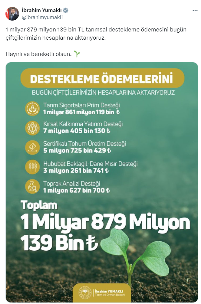 Bakan İbrahim Yumaklı sosyal medya hesabı üzerinden yaptığı açıklamada 1 milyar 879 milyon 139 bin Türk Lirası tarımsal destekleme ödemesinin, çiftçilerin hesaplarına aktarıldığını müjdeledi.