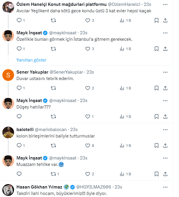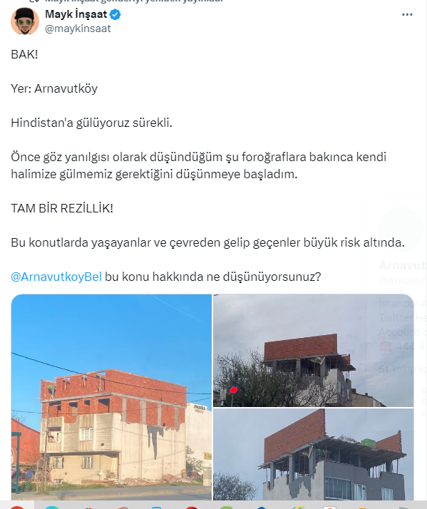 Akademisyen İnşaat Mühendisi Mayk İnşaat, X sosyal medya hesabı üzerinden Arnavutköy'de teshlike saçan bir binanın fotoğrafını paylaştı. 4 kattan oluşan binanın sadece iki katı yapılmış, son iki katı ise yarım şekilde bırakılmış. Hem burada yaşayanlar hem de çevre için tehlike saçan binayı görenler şok oldu. Mayk İnşaat'ın paylaşımı resmen yorum yağmuruna tutuldu. İşte o paylaşım ve gelen yorumlar...