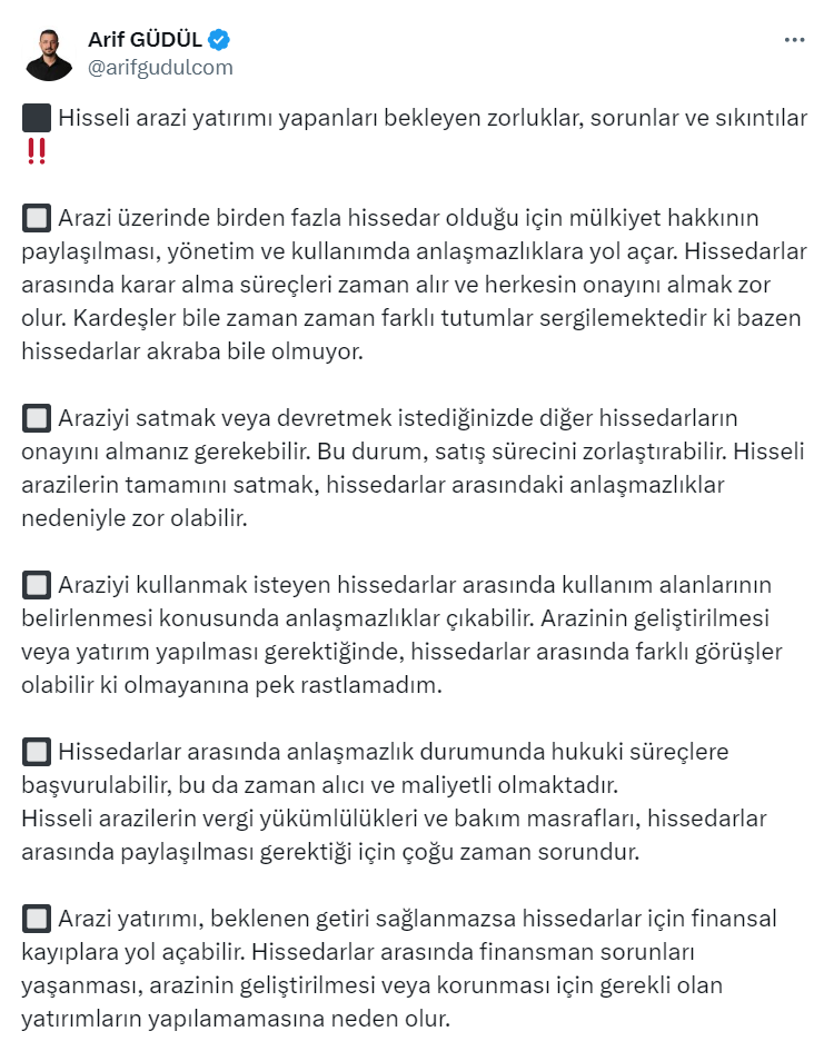 Arsa ve arazi yatırımları pek çok kişinin tercihleri arasına adını yazdırırken, Toprak Yatırımcısı ve talepbul'un Yönetim Kurulu Başkanı Arif Güdül resmi X hesabı https://x.com/arifgudulcom üzerinden hisseli arazi yatırımı yapanlar için flaş bir uyarı yaptı.