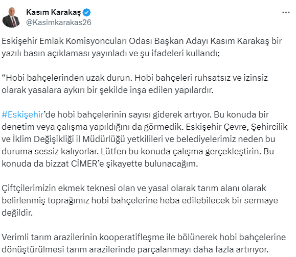 Eskişehir Emlak Komisyoncuları Odası Başkan Adayı Kasım Karakaş sosyal medya hesabı X'ten yaptığı basın açıklaması;