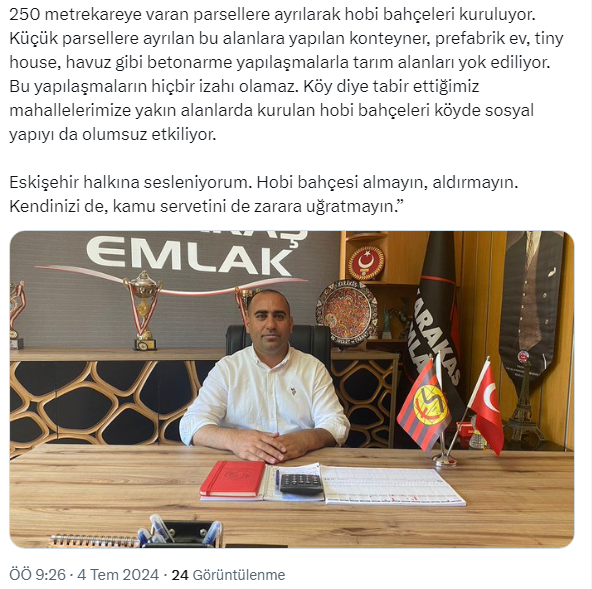 Eskişehir Emlak Komisyoncuları Odası Başkan Adayı Kasım Karakaş, Ççiftçilerin ekmek teknesi olan ve yasal olarak tarım alanı olarak belirlenmiş toprakların hobi bahçelerine çevrilmesine tepki gçsterdi.