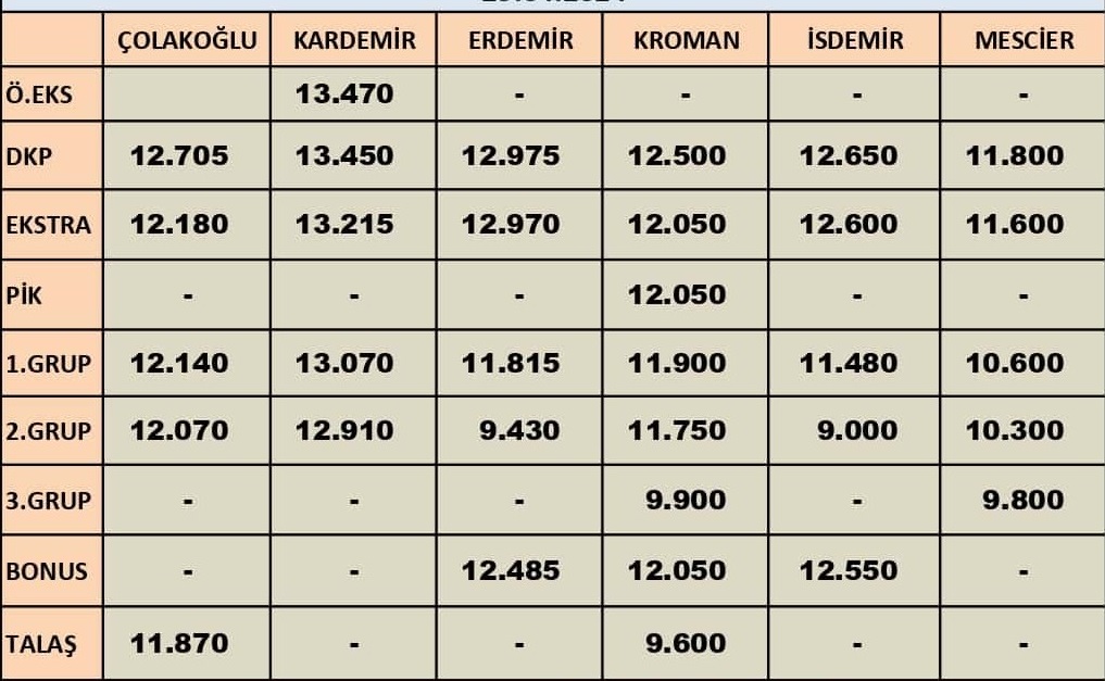 | Extra Hurda | 11,50 ₺/kg | 11,75 ₺/kg | 12,14 ₺/kg |