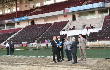Gençlik Hizmetleri ve Spor İl Müdürü Birdal Öztürk ve beraberindekilerle Hüseyin Avni Aker Stadı'nda incelemede bulunan Vali Yücel Yavuz, yetkililerden bilgi aldı.