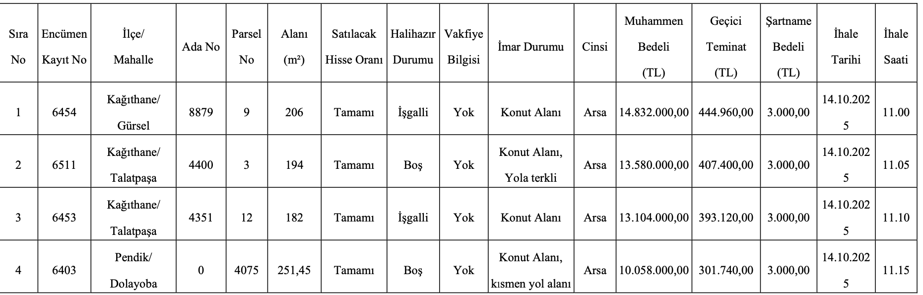 İstanbul Büyükşehir Belediye Başkanlığı, Kağıthane ve Pendik’te yer alan 4 adet arsayı satışa çıkardı. Konut imarlı arsaların satış ihalesi 14 Ekim’de yapılacak.