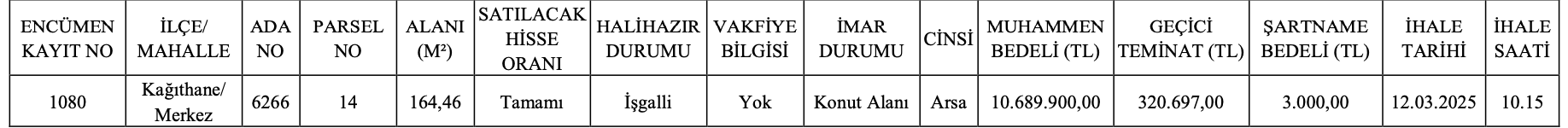 Arsanın satış ihalesi 12 Mart 2025 tarihinde saat 10.15’te İstanbul Büyükşehir Belediye Başkanlığı Encümen Salonu’nda yapılacak.