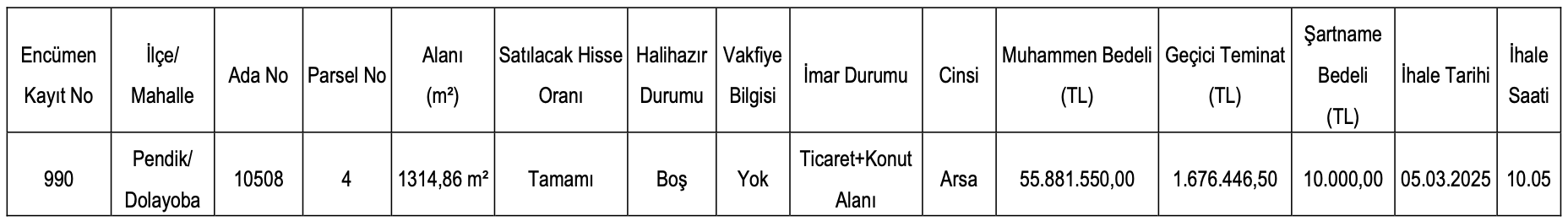 Arsanın satış ihalesi 5 Mart 2025 tarihinde saat 10.05’te İstanbul Büyükşehir Belediye Başkanlığı Encümen Salonu’nda yapılacak.