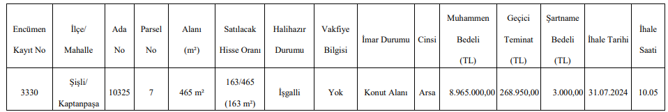 10325 ada 7 parselde yer alan konut alanı imarlı arsanın satış ihalesi 31 Temmuz 2024 tarihinde saat 10.05'te yapılacak.