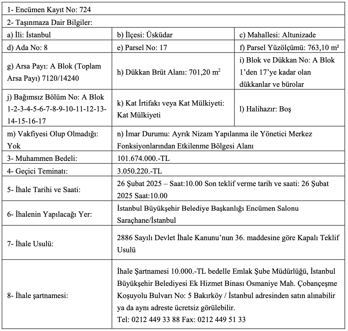 Altunizade’de bulunan iş yerlerinin satış ihalesi 26 Şubat 2025 tarihinde saat 10.00’da İstanbul Büyükşehir Belediye Başkanlığı Encümen Salonu’nda yapılacak.