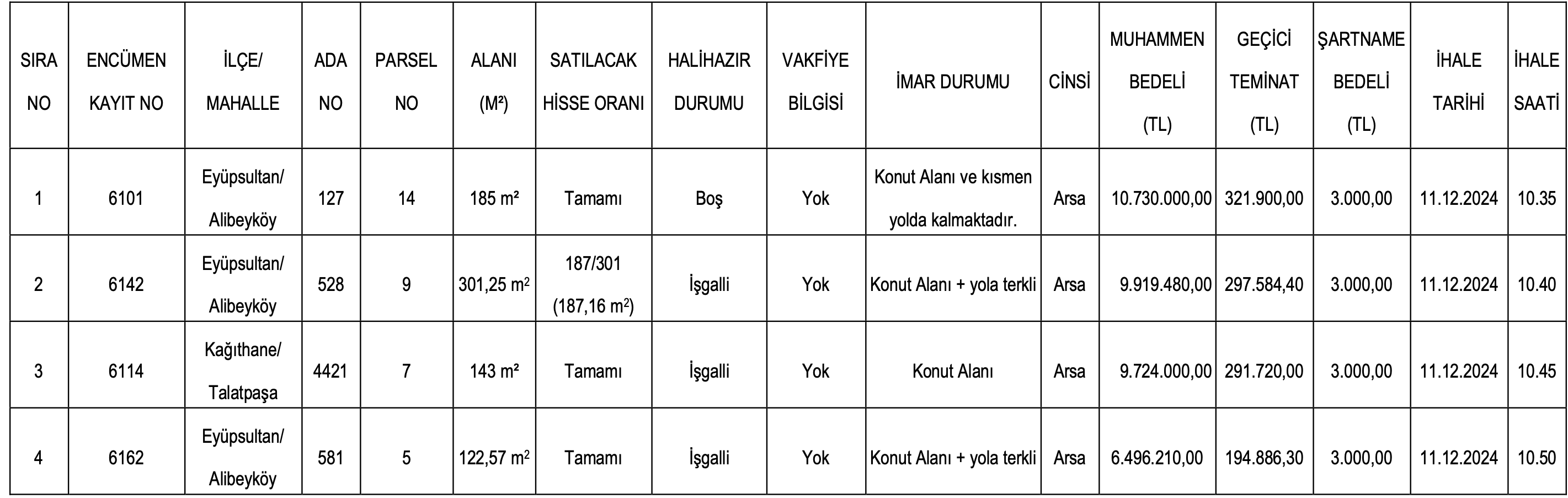 Söz konusu arsaların muhammen bedeller 6 milyon 496 bin 210 TL ile 10 milyon 730 bin TL arasında farklılık gösterirken, geçici teminat bedelleri ise 194 bin 886,30 TL ile 321 bin 900 TL arasında farklılık gösteriyor.