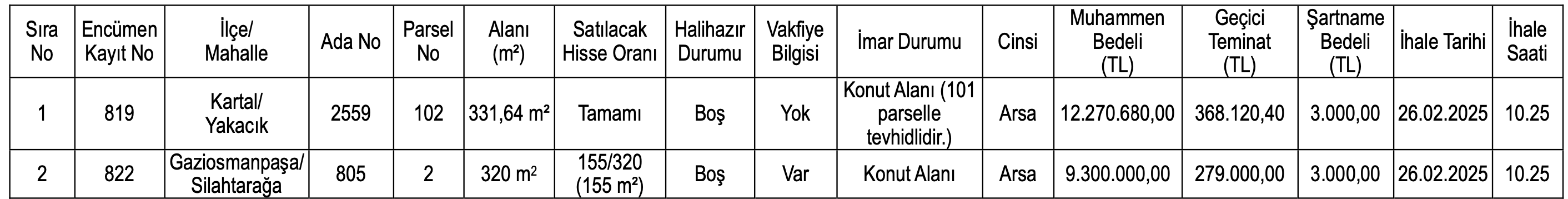 Yakacık ve Silahtarağa’da yer alan arsaların yüz ölçümleri 331,64 metrekare ve 320 metrekare olarak açıklandı. 320 metrekarelik arsanın 155 metrekarelik kısmının satışının gerçekleştirileceği belirtilirken, arsaların boş olduğu kaydedildi.